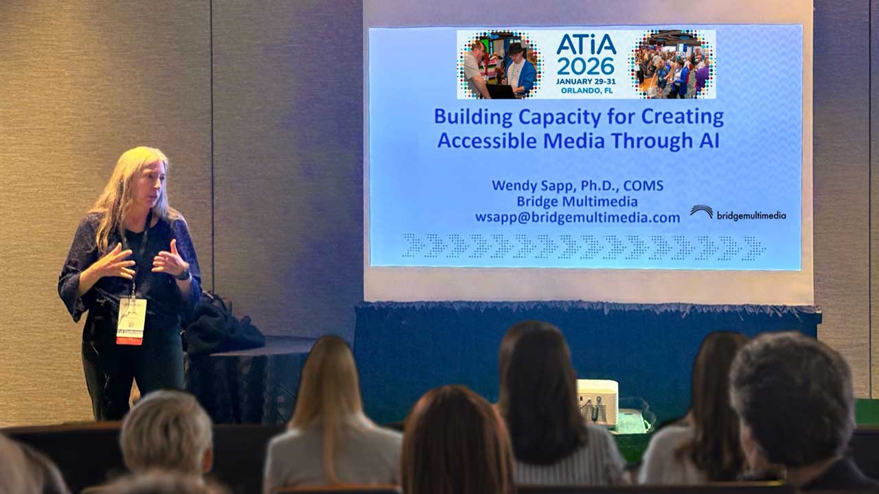 Bridge Multimedia’s Senior Project Director, Dr. Wendy Sapp, represented Bridge at the annual Assistive Technology Industry Association (ATIA) conference in Orlando. She delivered a well-received presentation entitled, Building Capacity for Creating Accessible Media through Artificial Intelligence. The session focused on Bridge’s WISER (Writing Improves Skills for Early Reading) products currently in development. These tools utilize AI to increase the capacity for producing accessibility by streamlining the process of creating accessible media and enhancing the quality of accessibility.